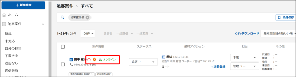 追客案件の一覧・詳細画面には状況に応じて特定のマーク(アイコン)が表示される場合があります。