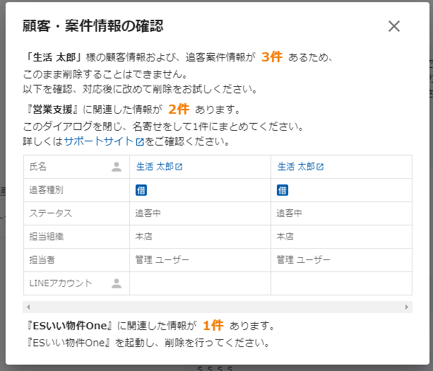 複数の追客が紐づいている場合「顧客・案件情報の削除」の確認画面が異なり、削除が出来ないので